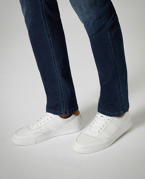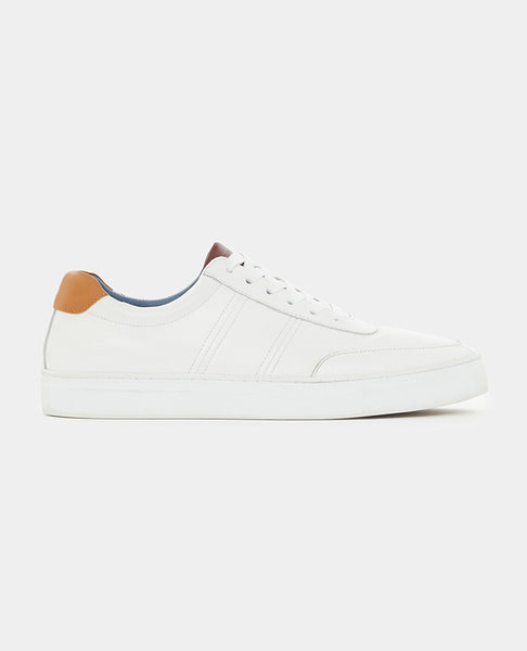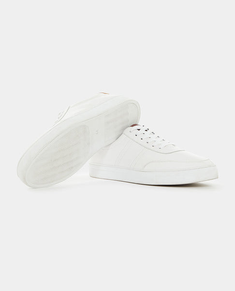 White leather sneaker with white rubber sole with contrast tongue and heel tab.