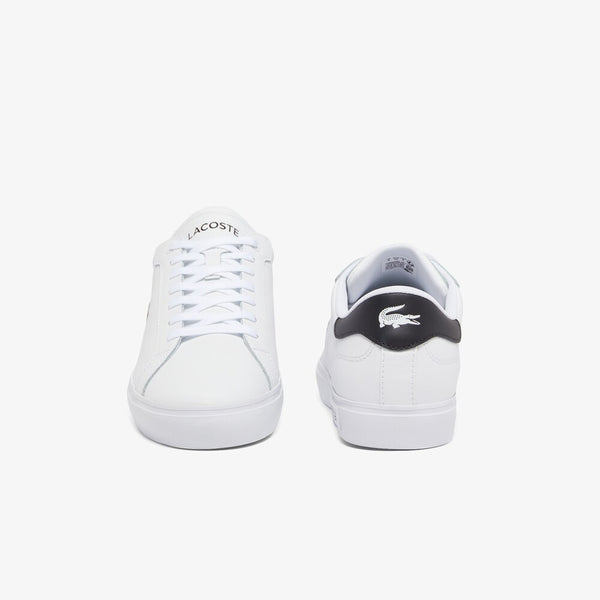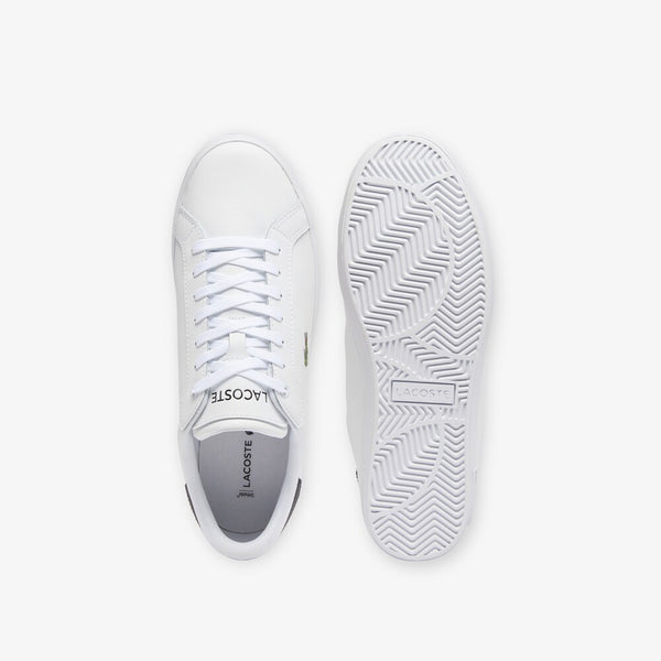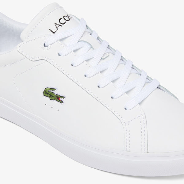 The Powercourt, a modern lace-up sneaker with versatile charm. Leather uppers boast a flat, burnished finish, complemented by contrasting crocodile for an urban edge. Embroidered branding highlighting Lacoste’s sporting heritage.