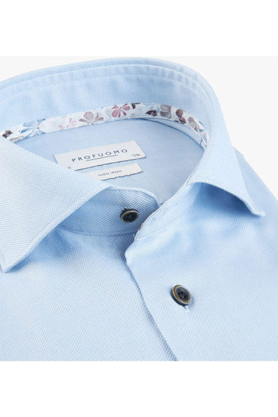 This blue cotton shirt with small contrast in the collar is a nice addition to your wardrobe. Simple, yet elegant. Perfect for any occasion. Non-iron and slim fit.