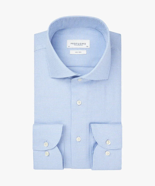 This blue shirt in dobby structure is a basic addition to your wardrobe. Simple, yet elegant. Perfect for any occasion. Non-iron and slim fit. The added 3% stretch provides just that bit of extra comfort you need.