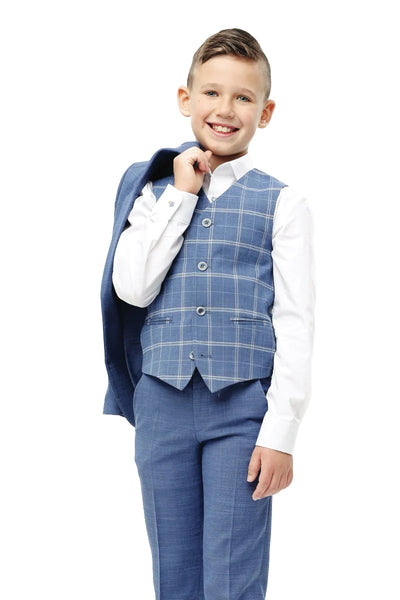 Beautiful and expertly crafted Boys 3 piece Suit with contrast blue check waistcoat. The Best of the best.